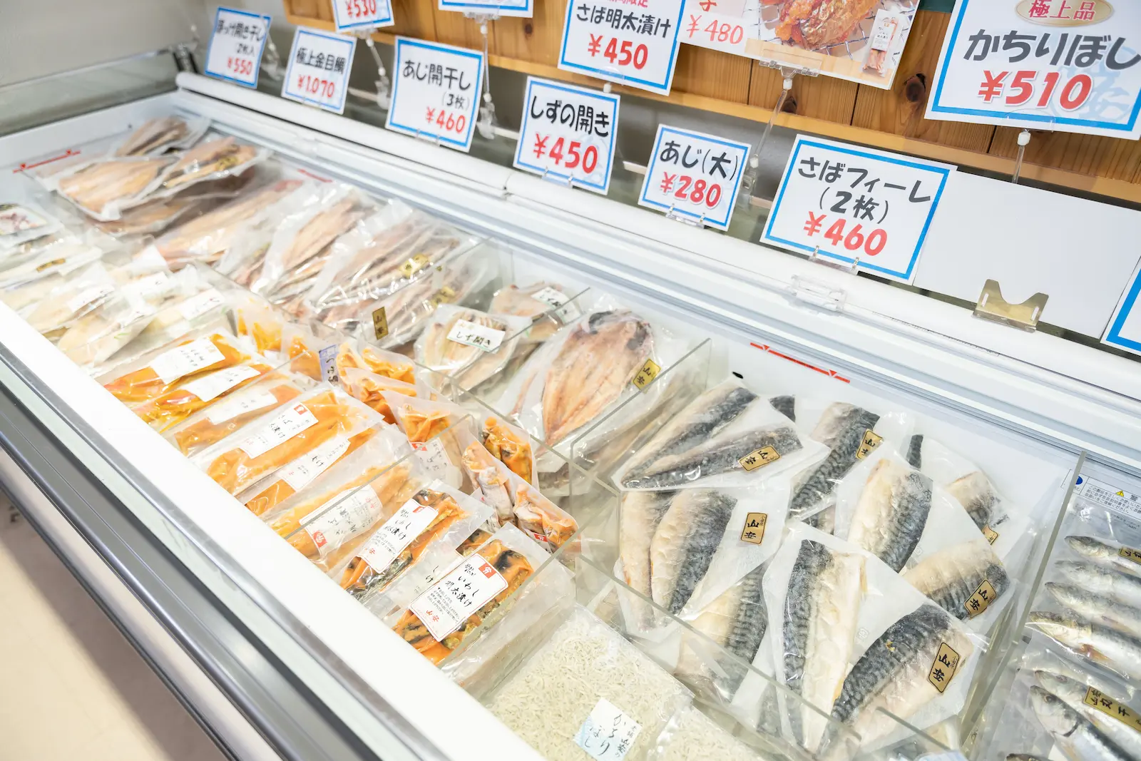 大洋テクノ1F売店では、小田原ひもの山安の工場直送品やその他食料品など、他店ではあまり見かけない商品を取り扱っております。